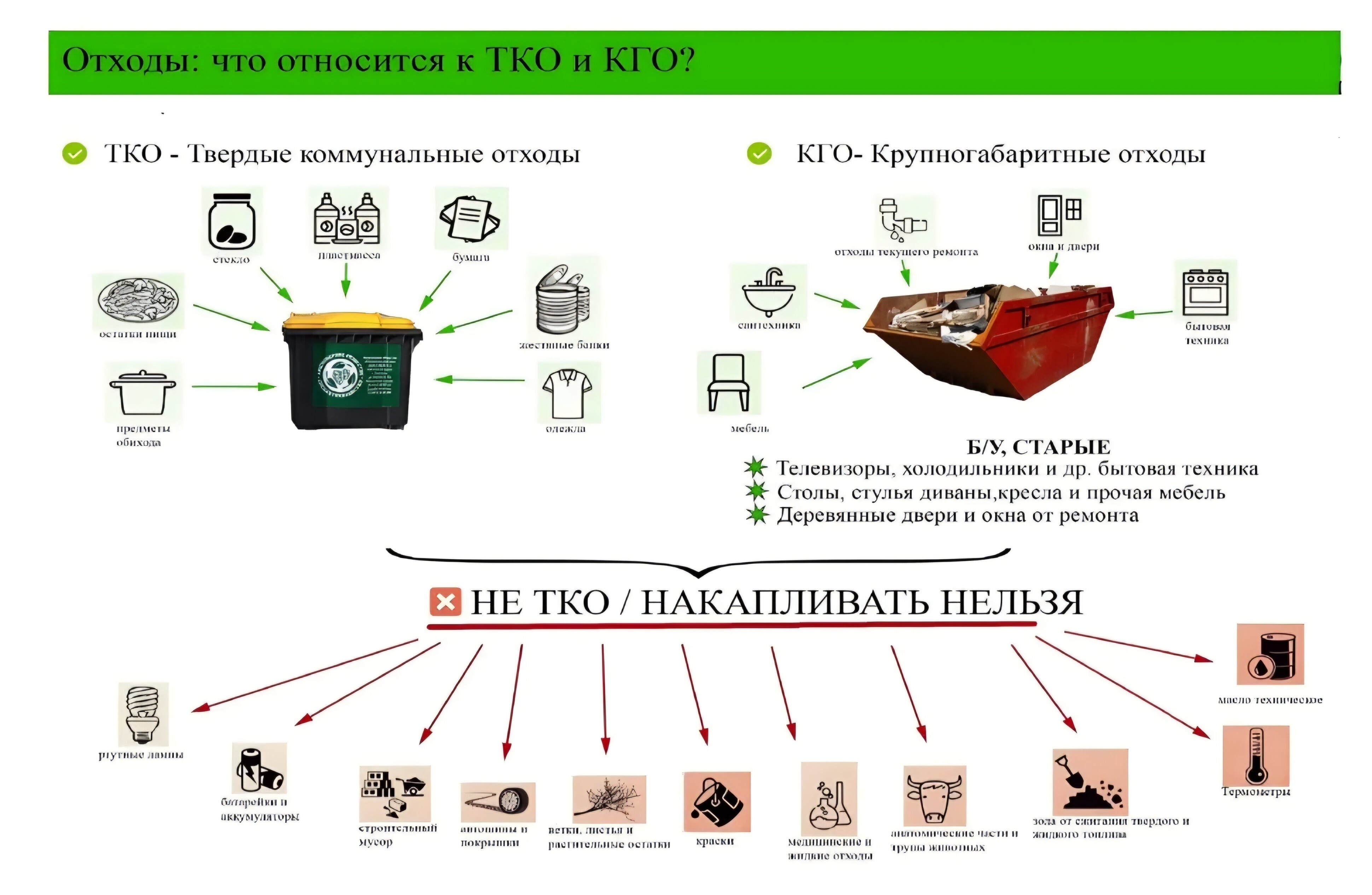 Твердые коммунальные отходы (ТКО) – это отходы, образующиеся в жилых помещениях в процессе потребления физическими лицами, а также товары, утратившие свои потребительские свойства в процессе их использования физическими лицами в жилых помещениях для удовлетворения личных и бытовых нужд. К ТКО также относятся отходы, образующиеся в процессе деятельности юридических лиц и индивидуальных предпринимателей, если они по составу аналогичны отходам, образующимся в жилых помещениях. - Крупногабаритные отходы (КГО) – это отходы, которые не поддаются сжатию и транспортировке в прессующем мусоровозе. К ним относятся, например, предметы мебели, бытовой техники, сантехнического оборудования. - Строительный мусор (мешки с песком, бетоном, арматура и т.п.) не относится к ТКО или КГО. Его сбор и транспортировка не входят в обязанности регионального оператора АО «Югра-Экология», в рамках установленного единого тарифа на услуги по обращению с ТКО, согласно Федеральному закону от 24.06.1998 № 89-ФЗ «Об отходах производства и потребления». Отходы, образовавшиеся в результате капитального ремонта, строительства, сноса конструкций в квартире, например, бетон, кирпичи, стёкла, оконные рамы и прочие относятся преимущественно к IV классу опасности. Житель вправе самостоятельно заключить договор с компанией, имеющей лицензию на транспортировку строительных отходов, которая будет их вывозить на возмездной основе. На территории города Когалыма такие услуги оказывает ООО «ЭкоТехСервис», контактный телефон: Волошенюк Николай Николаевич, тел. 8-951-967-48-65. Нарушение правил складирования мусора на контейнерных площадках влечет за собой привлечение к административной ответственности. В случае ненадлежащего использования контейнера для КГО (складирования производственного или строительного мусора), данный контейнер будет вывезен без возврата. Для информирования населения по обозначенной тематике Вы вправе использовать материалы и ссылки, размещаемые региональным оператором АО «Югра-Экология» на официальных страницах в социальных сетях.